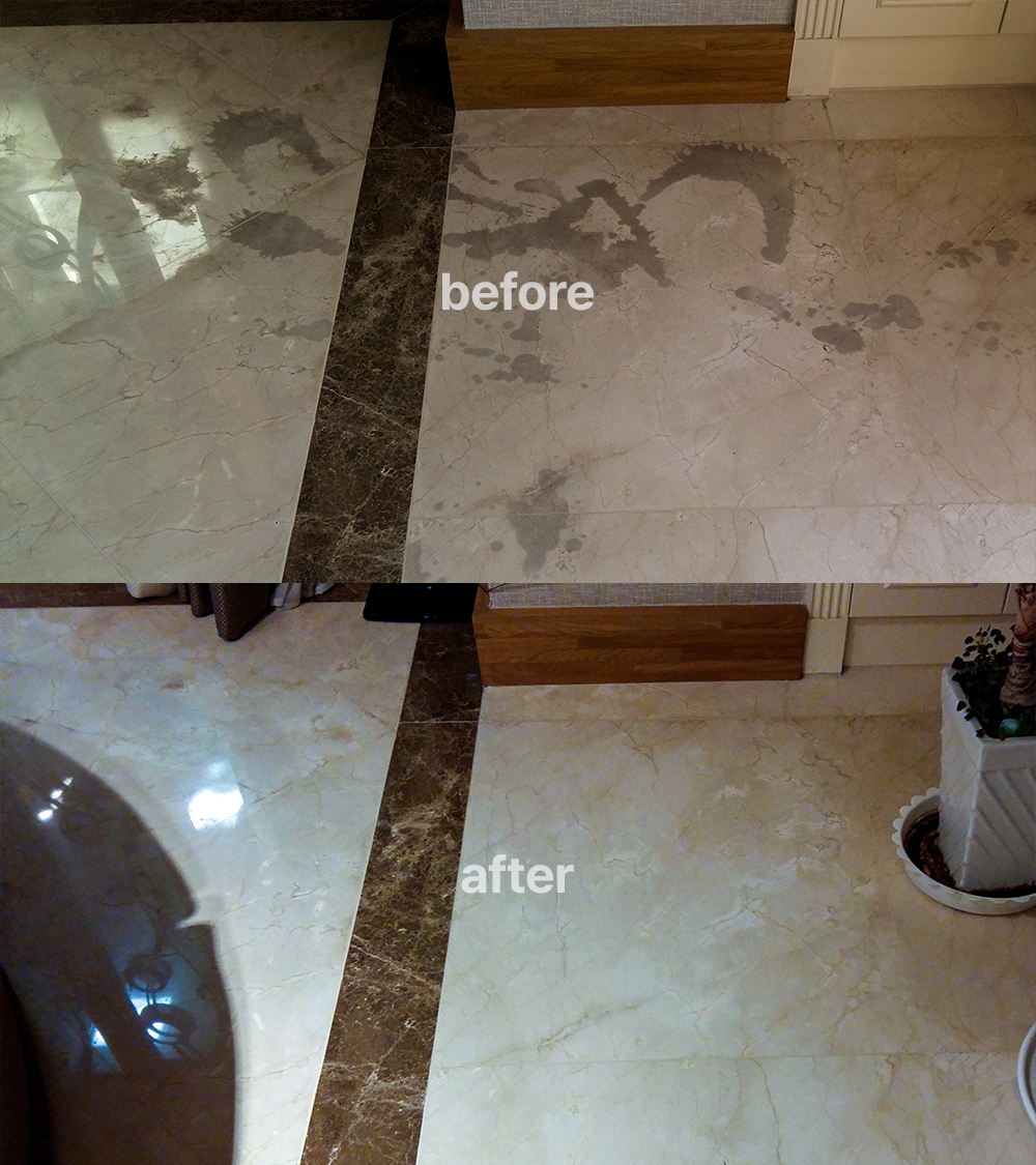 일반적으로 수분에 장기간 노출되면 석재가 함유한 고유의 성분이 수분과 반응하며, 백화, 황변 등의 오염으로 나타나기도 합니다.